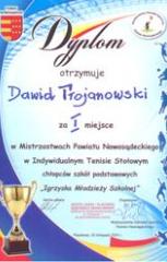 26.11.2014 r.Uczeń naszej szkoły Dawid Trojanowski zdobył I miejsce w Mistrzostwach Powiatu Nowosądeckiego w Indywidualnym Tenisie Stołowym chłopców szkół podstawowych. Gratulacje!!!