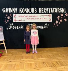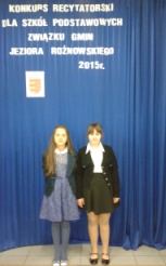 15.04.2015 r.Nasze uczennice: Aleksandra Baziak z klasy IV i Gabriela Gieniec z klasy VI wzięły udział w Konkursie Recytatorskim dla Szkół Podstawowych Związku Gmin Jeziora Rożnowskiego. Ola przygotowała dwa utwory: Zygmunta Miłoszewskiego "Góry Żmijowe" (fragment) i Ludwika Jerzego Kerna " Dialog z pluskwą". Gabrysia natomiast fragment "Syzyfowych prac" Stefana Żeromskiego i utwór Wisławy Szymborskiej "Minuta ciszy po Ludwice Wawrzyńskiej", zdobywając I miejsce. Serdecznie gratulujemy!!!